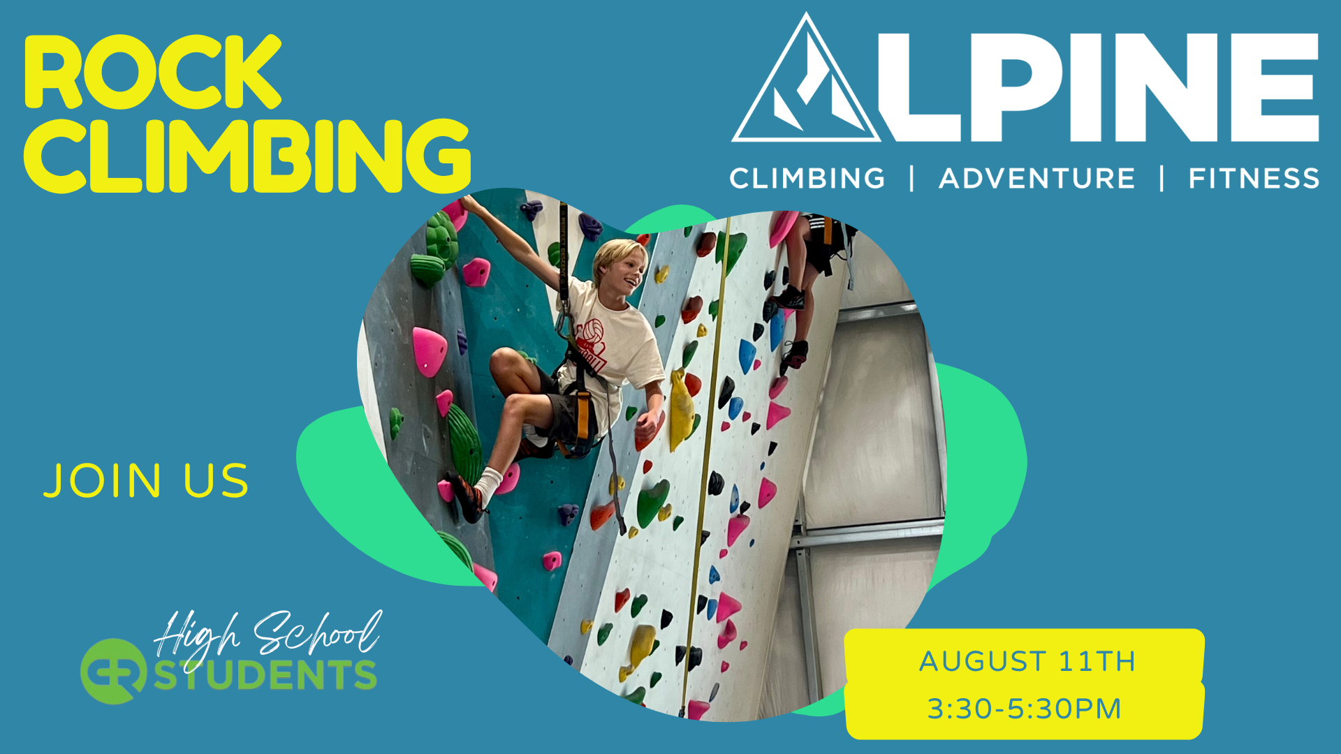 High School Climb day at Alpine on Sunday 8/11 3:30-5:30 pm! Cost is $20/student unless you are already a member! (Email Pastor Greg is you already have a membership!) REGISTER HERE